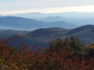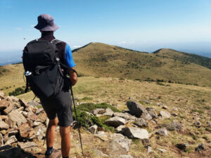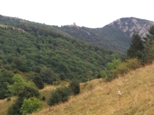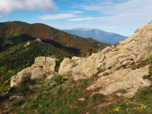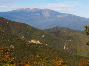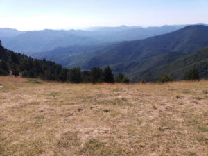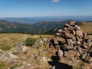 Au loin on devine les pistes de ski de Font Romeu en forme de IX. A l'horizon: le massif du Puigmal.