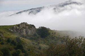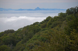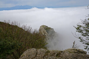 Sommet du Bassagoda dans les garrotxes de Catalogne sud qui émerge de la mer de nuages.