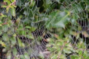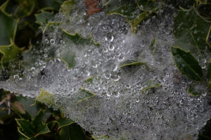 Quelques perles de rosée sur cette toile d'araignée au milieu des feuilles de houx.