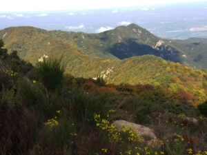 Au fond, l'antenne du pic Neulos, le plus haut pis sur la crête des Albères ( 1256m d'altitude)