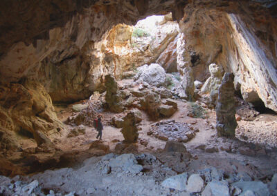 Grande grotte avec de belles stalagmites et stalactites plus des gravures anciennes.